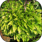Leaves emerge in spring with chartreuse centers and a dark green margin.Pale purple flowers in summer. 13"T x 20"W