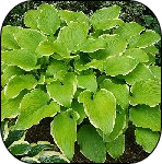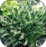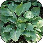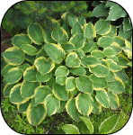 Rounded, heart-shaped green leaves, with a yellow margin, turning creamy-white in summer. Pale purple flowers. 8"h x 24"w