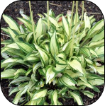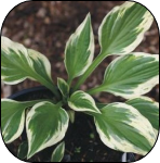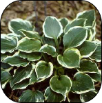 Medium. Glossy dark green leaves with wavy gold margins, turning creamy-white in summer. Lavender flowers. 20"h x 30"w