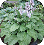 Wide, dark green with good substance, and heavily rippled margins. Lavender flowers in July. 26″ H by 50” W