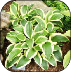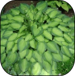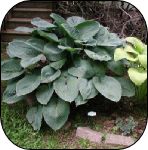 Blue green foliage and corrugation. Overlapping large heart-shaped leaves. Near white flowers. 28" H x 64" W