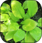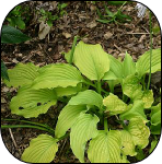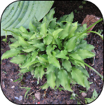 Medium - a yellow hosta with thick leaves; serrated edges on the margin. Piecrust edges. Lavender flowers in early summer